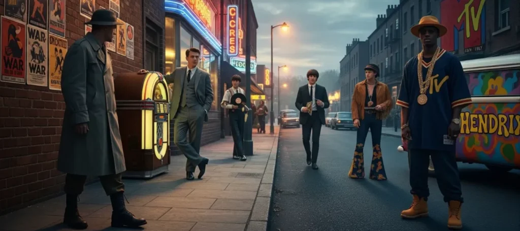 - The 1960s–70s: Music became a style leader. The Beatles popularized the Mod look, while Jimi Hendrix brought in psychedelic prints and fringe.